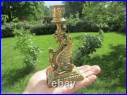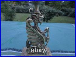 Chandelier ancien « Chimère », bronze doré, milieu du XIXe siècle, époque de Napoléon III, France. Un chandelier ancien pour une bougie en bronze, rare et magnifique, magnifique bronze fait à la main par un maître français du 19ème siècle! Le chandelier ancien « Chimère » est une sculpture tridimensionnelle avec une intrigue originale, très bien faite! Le chandelier antique est massif, lourd et richement décoré : au centre se trouve un grand dragon chimère sur une base rectangulaire. Le bougeoir est en bronze avec dorure, en très bon état pour son âge, car il a plus de 150 ans! Un bougeoir ancien de taille moyenne, mais lourd et très stable, dimensions : hauteur – 15,5 cm, socle – 6 x 7,5 cm. Antique « Chimera » candlestick, gilt bronze, mid-19th century, Napoleon III period, France. A rare and magnificent antique single-candle bronze candlestick, beautifully handcrafted by a 19th-century French master! The antique « Chimera » candlestick is a three-dimensional sculpture with an original plot, very well crafted! The antique candlestick is solid, heavy, and richly decorated: in the center is a large chimera dragon on a rectangular base. The candlestick is made of gilt bronze, in very good condition considering its age, as it is over 150 years old! A medium-sized, but heavy and very stable antique candlestick, dimensions: height – 15.5 cm, base – 6 x 7.5 cm.